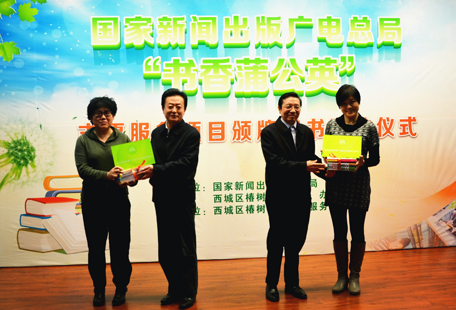 11月26日下午,国家新闻出版广电总局“书香蒲公英”志愿服务项目颁牌赠书活动在北京市西城区椿树街道办事处举行。中央直属机关工作委员会副书记、组织部部长段余应,国家新闻出版广电总局党组成员、副局长孙寿山出席活动。“书香蒲公英”项目由总局椿树街道志愿服务队与椿树街道志愿者分会共同策划。其宗旨是以书为平台,通过帮扶社区书屋建设、科普讲座、读书大使进社区、文化结对等多种形式的活动,助力椿树街道所辖社区打造“全民阅读示范社区”。