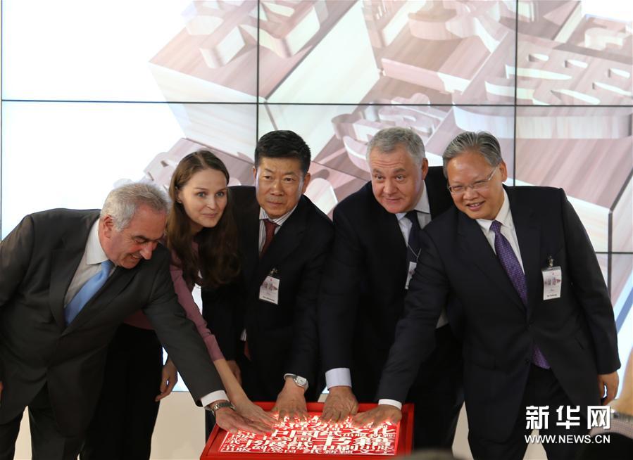 11月16日,在罗马尼亚首都布加勒斯特,中国驻罗马尼亚大使徐飞洪(右一)、罗马尼亚国家广播电台总裁奥维迪乌·米库列斯库(右二)、中国国家新闻出版广电总局副局长阎晓宏(右三)、罗马尼亚文化部国务秘书安卡·德勒戈伊(右四)等出席图书展开幕式,并为中国主宾馆展台揭幕。