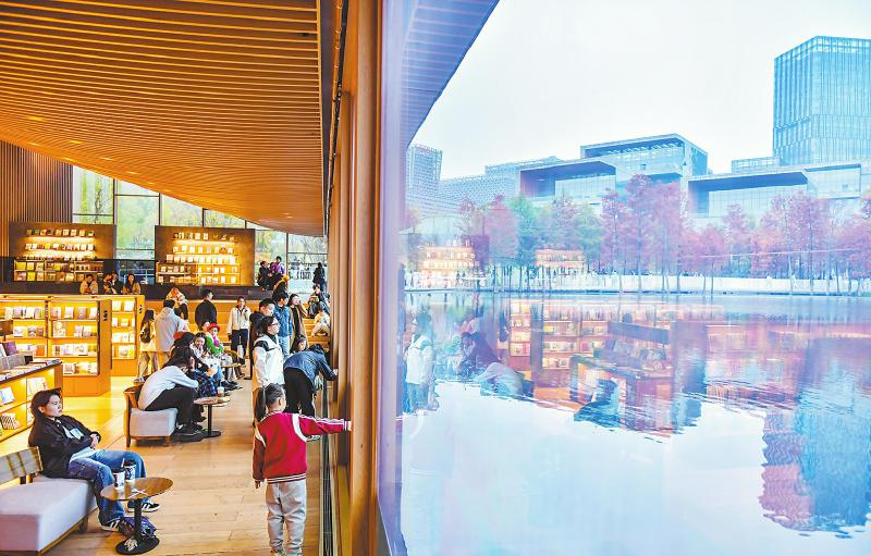 11月16日,四川天府新区成都科学城兴隆湖畔,游客体验别样的阅读之美。
