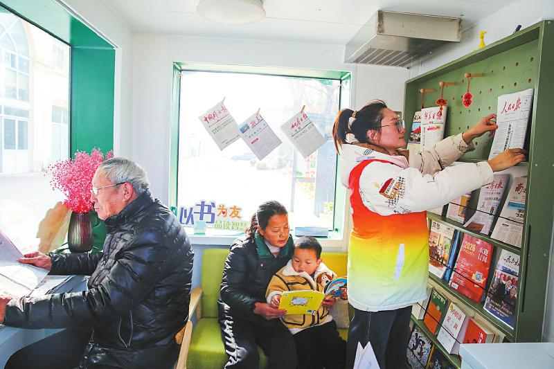 江苏省如皋市如城街道凌青村广场上,基层阅读推广人(右一)在便民报刊亭里整理报刊、上架新增报刊。