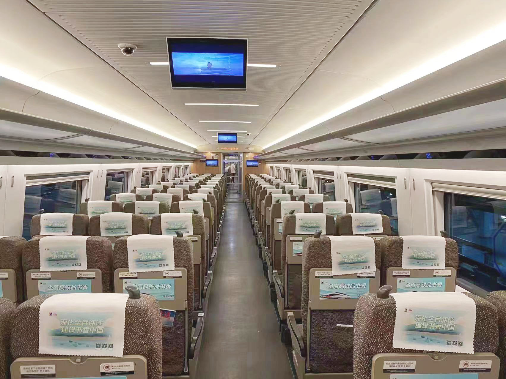 在书香列车上,每节车厢两侧的车窗内张贴有第二届全民阅读大会标识和书香铁路标识,车厢连接处、小桌板背面张贴有大会宣传海报,每个座位放置印刷包含大会标识和铁路元素的头枕片,车厢列车视频播放第二届全民阅读大会公益广告视频,全民阅读大会元素在车厢内随处可见。此外,餐车上设置有读书角,摆放优秀图书供旅客阅览,同时为了弘扬中华优秀传统文化,列车上还安排身穿汉服的工作人员与旅客开展阅读互动,参与互动的旅客可以获赠一本图书。