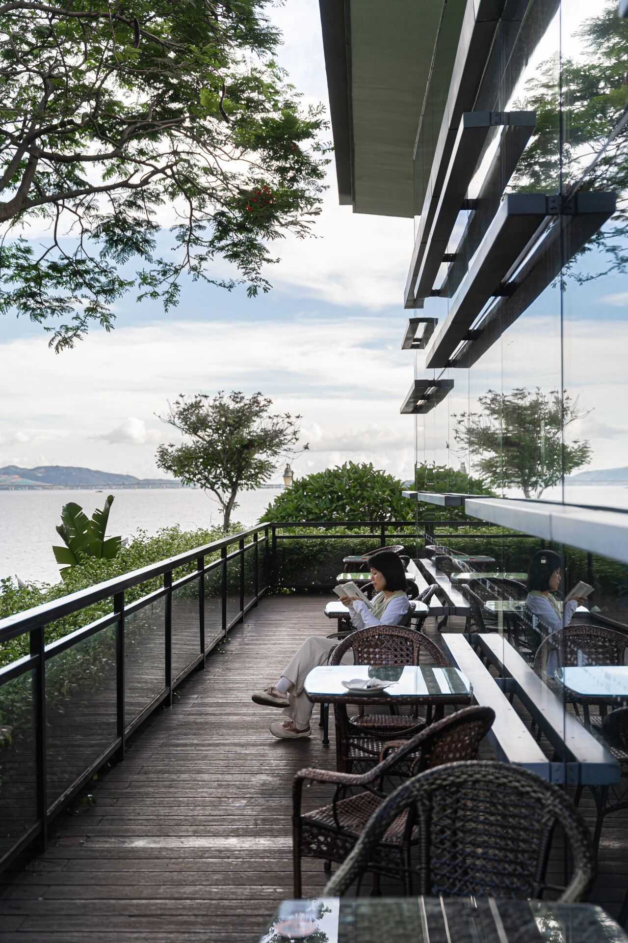 倘若想近距离感受海风迎面,推荐室外阅读区,除了看书,还能看海、看日落、看树影,看书看累了的时候,坐在藤椅上发发呆,也是一种不错的享受。