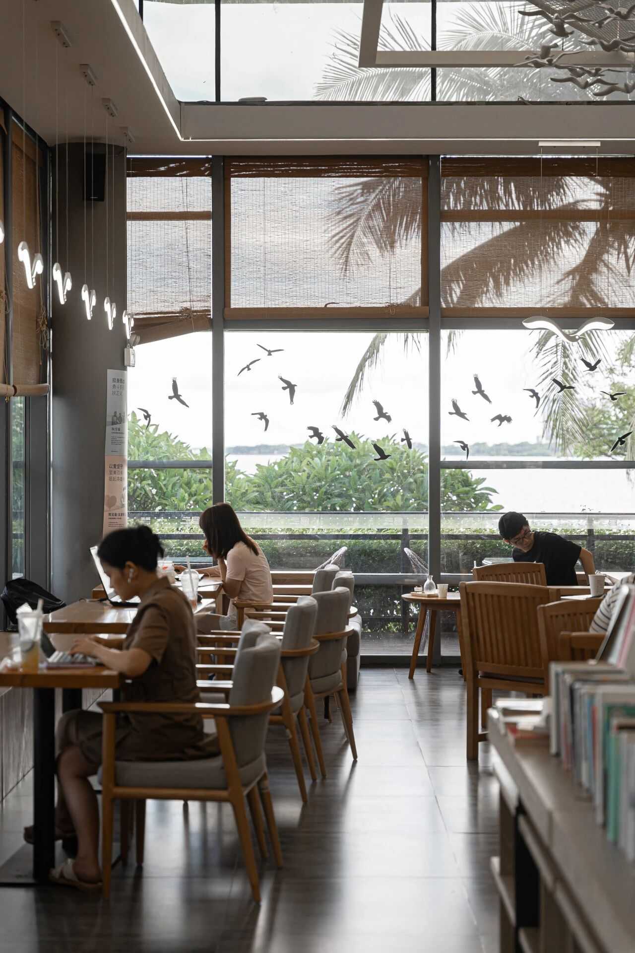 深圳湾海岸沿岸的白鹭坡书吧,四周被大海与绿林环绕,醒目的落地窗被誉为“最美玻璃房书屋”。