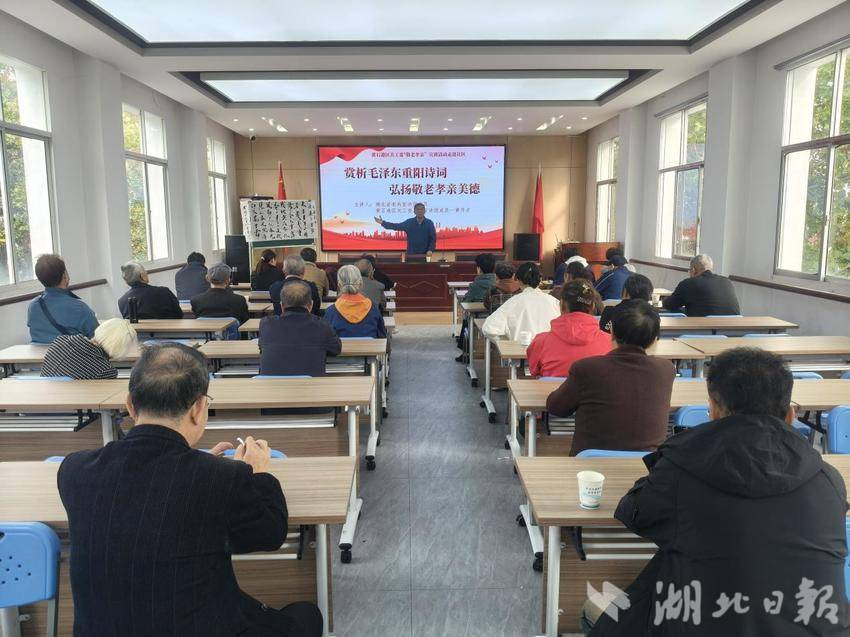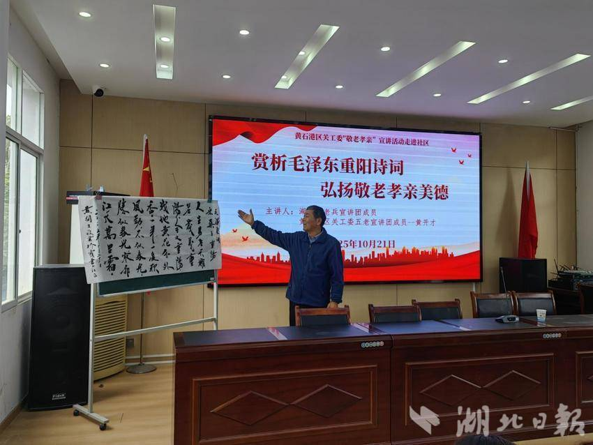 重阳节来临之际,黄石港区覆盆山社区特邀黄石港区关工委“五老”宣讲团成员黄开才,举办“赏析毛泽东重阳诗词 弘扬敬老孝亲美德”主题宣讲活动,吸引了社区老年居民、青少年代表及党员干部共计50余人参与。