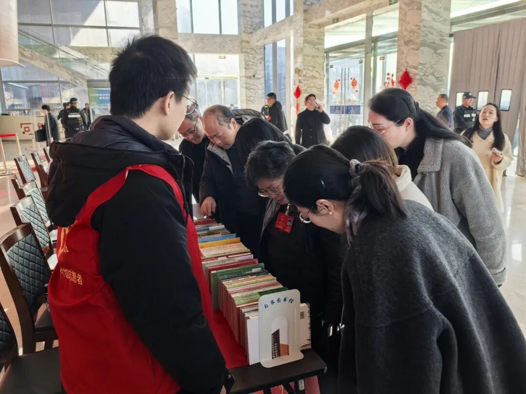 “两会”期间,图书馆志愿服务队主动走进会场,开展免费赠书活动。此次赠书清单精心筛选,涵盖政治理论、法律法规、红色经典、文学历史、地方特色文献等多元领域。现场特设赠书展示专区,书籍分类清晰、陈列规整,志愿者全程提供针对性推荐服务,助力代表委员快速精准获取高质量履职参考资料,让每一本图书都成为参政议政的“智慧锦囊”。
