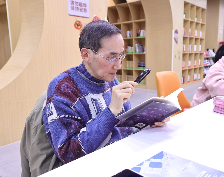 只见老先生戴着眼镜,端坐在桌前,左手持书,右手拿着一把放大镜,在书页上逐行移动,全神贯注。工作人员告诉记者,这位老先生最爱看书了,每天必来打卡,一待就是整一天。趁老先生站起来给保温杯添水,记者上前和他聊了起来。