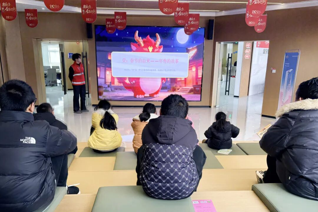 活动伊始,返乡大学生志愿者刘林杰化身“青春领读人”,带着饱满的热情,带领孩子们逐字逐句品读春节相关古诗名篇,生动讲述春节由来、年俗传说等趣味故事。朗朗书声回荡在活动现场,趣味传说点燃孩子们的好奇心,大家在诵读中感悟中华传统文化的博大精深,在聆听中感受新春佳节的独特韵味。