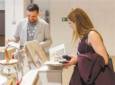 两名参展商在中国联合展台翻阅《红楼梦》画册