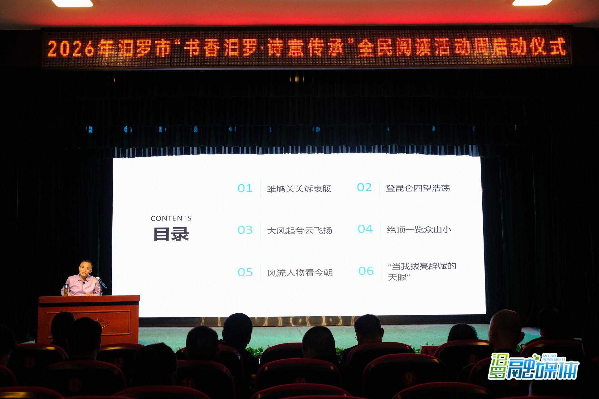 4月20日,四川省汨罗市2026年“书香汨罗·诗意传承”全民阅读活动周启动仪式暨蓝墨水文化大讲堂(第二期)活动举行。汨罗市委常委、宣传部部长胡鹤出席并宣布活动周正式启动。汨罗市文化旅游广电局机关及二级单位全体干部职工、各镇宣传委员、文化站长,以及全市各界诗歌文学爱好者参加活动。
