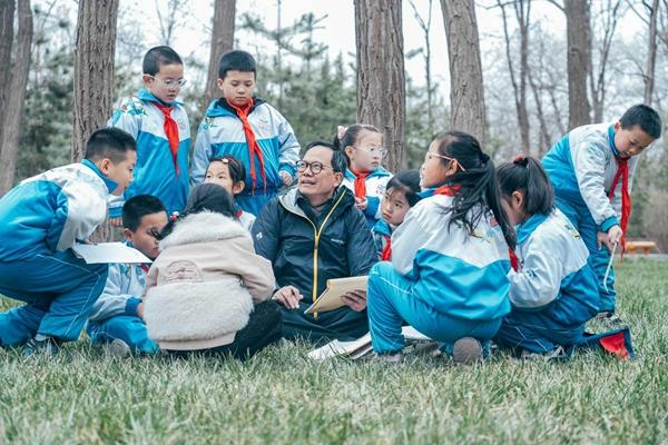 儿童文学作家雪野带领泾川县东街小学学生进行田野童诗创作。图片由泾川县教育局提供