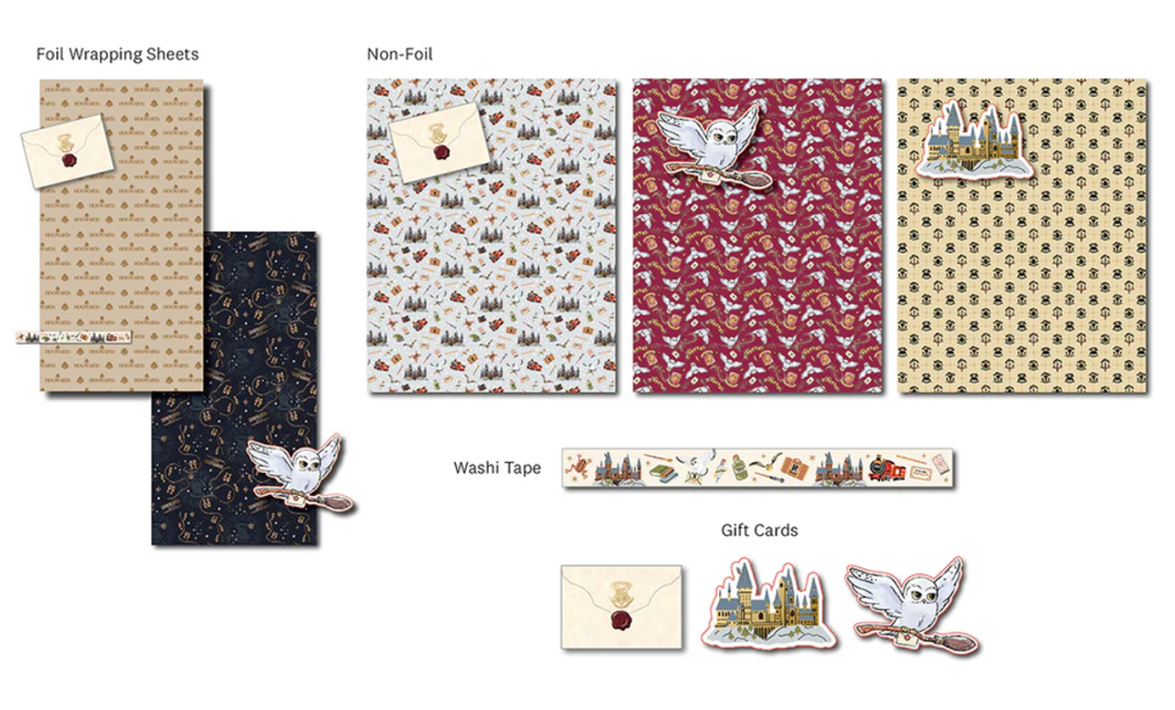 2024年12月,美国出版商Insights editions推出《哈利·波特》霍格沃茨礼品文具套装,是一款为哈迷量身打造的豪华礼物。该套装共有5种独特霍格沃茨主题包装纸、3款精美的礼品标签卡、3种颜色的薄棉纸、纸胶带、蜡封贴纸和装饰细绳,提供丰富的混搭包装方案。